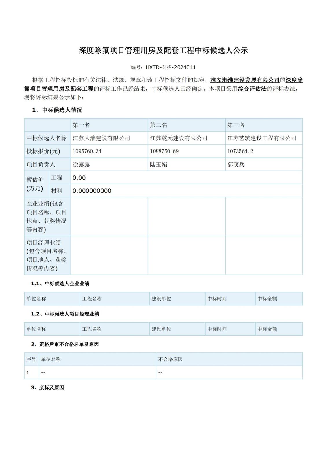 深度除氟項目管理用房及配套工程中標候選人公示
